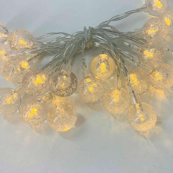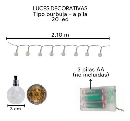 Luces decorativas a pila tipo burbuja Modelo: LUNB2MPCE Marca: Etheos Luces decorativas a pila tipo burbuja Voltaje: 4,5 Vdc Funciona con 3 baterías AA (no incluidas) Longitud: 2 m Cantidad de LEDs: 20 unidades Separación entre LEDs: 10 cm Temperatura de color: 2700 K Funciones de luz: fija / flash Potencia por LED: 0,06 W Diámetro de lámpara: 2,3 cm Origen: China